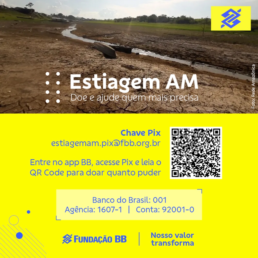 O Banco do Brasil e a Fundação BB lançam campanha em apoio às pessoas atingidas pela forte estiagem no estado do Amazonas. A campanha conta com apoio de unidades do conglomerado BB para a divulgação em canais múltiplos que abrangem clientes PF, PJ e demais segmentos negociais. As doações serão revertidas em alimentos e água potável que chegará aos amazonenses que estão mais precisando. A campanha já inicia com R$ 1 milhão em caixa, a partir de doação do BB e da Fundação BB.