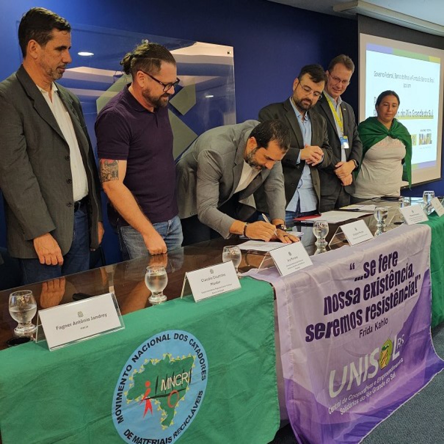 BB e Fundação Banco do Brasil realizaram, nesta semana, na Casa do Governo Federal no Rio Grande do Sul, a cerimônia de solenização das ações para a reconstrução das unidades de triagem de material reciclável atingidas pelas enchentes de 2024. Representantes do Governo Federal, do BB e da Fundação Banco do Brasil participaram do evento com o objetivo de firmar convênios de cooperação para reestruturação de 22 empreendimentos econômicos solidários locais.